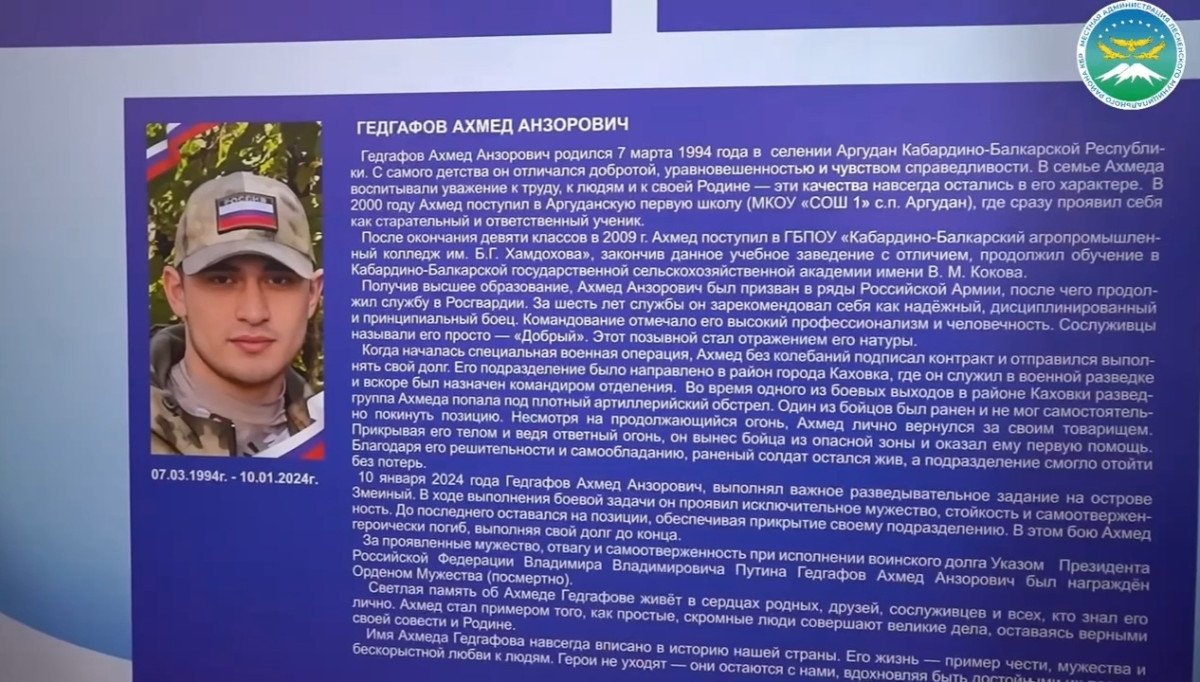 Ахмед Гедгафов (1994 г.р.) после службы в Росгвардии подписал контракт для участия в Специальной военной операции, служил в военной разведке. Погиб 10 января 2024 года на острове Змеиный, прикрывая свое подразделение. Награжден орденом Мужества (посмертно).