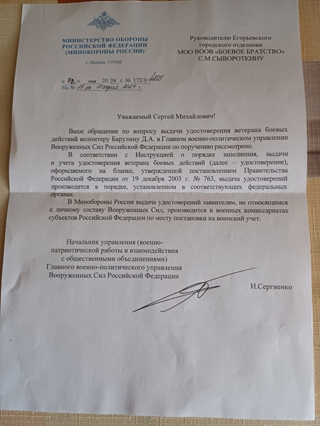 “Один из серьёзных вопросов - законность пребывания в зоне СВО наших добровольцев, доставляющих гуманитарный груз. Они рискуют жизнью, подрываются на минах, попадают под обстрелы артиллерии, дронов”, - пишут из Подмосковья. - “Этот вопрос завис, хотя руководитель Егорьевского отделения Сергей Сывороткин письменно обращался в Главное военно-политическое управление МО РФ (ответ прилагается). Решение возложено на военные комиссариаты, но воз и ныне там”.