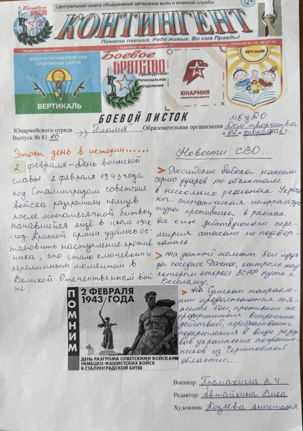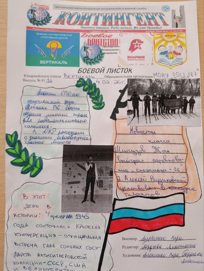 «В течение недели наши юнкоры готовились к выпуску очередных номеров «Боевых листков». Юнкоры школы №93 О. Ширяева, В. Панкратова рассказали о соревнованиях по спортивному туризму “ПРО-вело” и соревнованиях по лыжам в Зауральной Роще, о новостях СВО. Юнармейцы школы №87 Вера Алексеенко и Анастасия Гордеева осветили новости класса и СВО. Яна Панкратова, Богдан Вороной, Булат Вафин из школы №65 рассказали о новостях СВО, об истории страны в годы Великой Отечественной войны, об экскурсиях класса. В школе №9 В. Промахина, Виктория Автайкина, Анастасия Козеева рассказали о новостях СВО, о событиях 02 февраля 1943 года. Конкурс продолжается», — сказал Леонид Колчинский.
