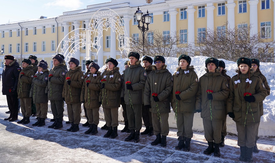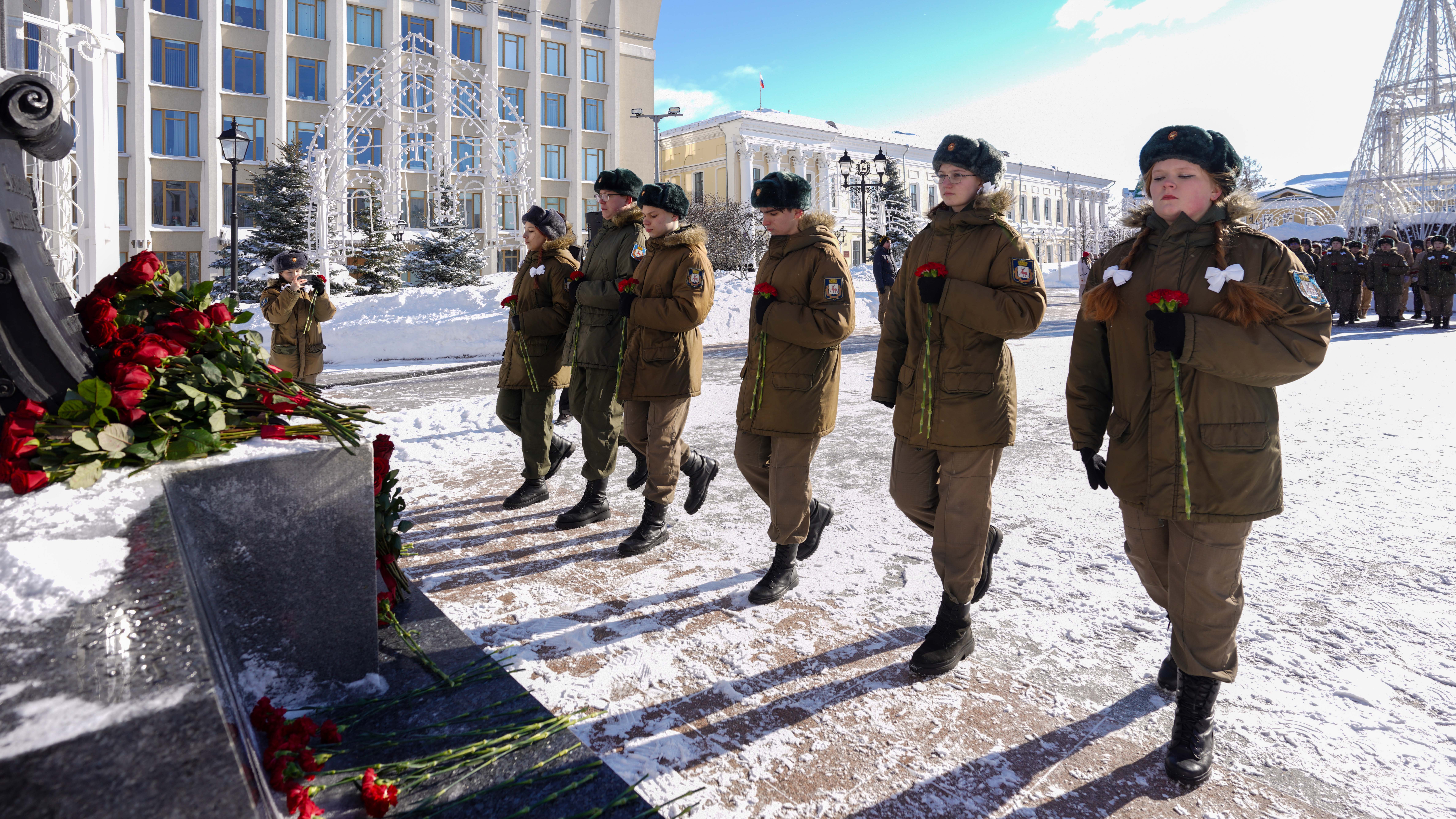 Пост №1 имени дважды Героя Советского Союза гвардии генерал-лейтенанта авиации Василия Рязанова дворца детского творчества имени Валерия Чкалова представляли старшеклассники школы №93, заступившие на вахту Памяти у Вечного огня в Нижегородском кремле.