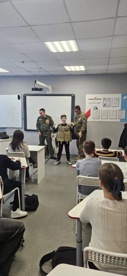 Они посетили среднюю школу №1, где рассказали ребятам о современных видах вооружения Российской армии, их характеристиках и применении, а также провели инструктаж по надеванию бронежилета. Особое внимание было уделено алгоритмам действий при различных травмах.
