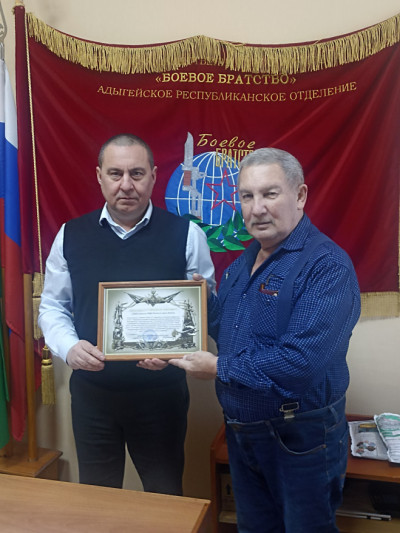 За поддержку участников Специальной военной операции благодарственные письма были вручены руководителю Адыгейского «БОЕВОГО БРАТСТВА» Алексею Харитонову и председателю городского Совета ветеранов МВД, ветерану организации Алексею Меркицкому.