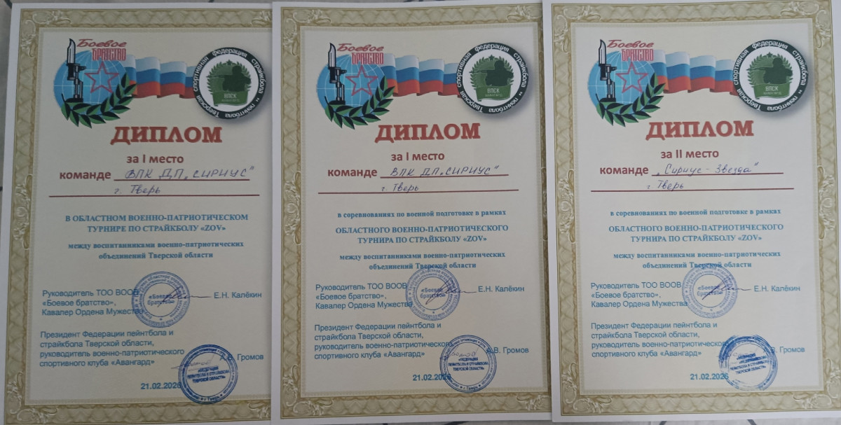 По результатам турнира команда воспитанников тверских ветеранов «БОЕВОГО БРАТСТВА» из военно-патриотического клуба десантного профиля «Сириус» заняла первое место. Состав команды: Анастасия Волкова (капитан), Вячеслав Блохин, Иван Ивашкин, Лука Русу и Никита Русу, руководитель — член областного совета, секретарь исполкома Тверского отделения «БОЕВОГО БРАТСТВА» Анастасия Склярова.