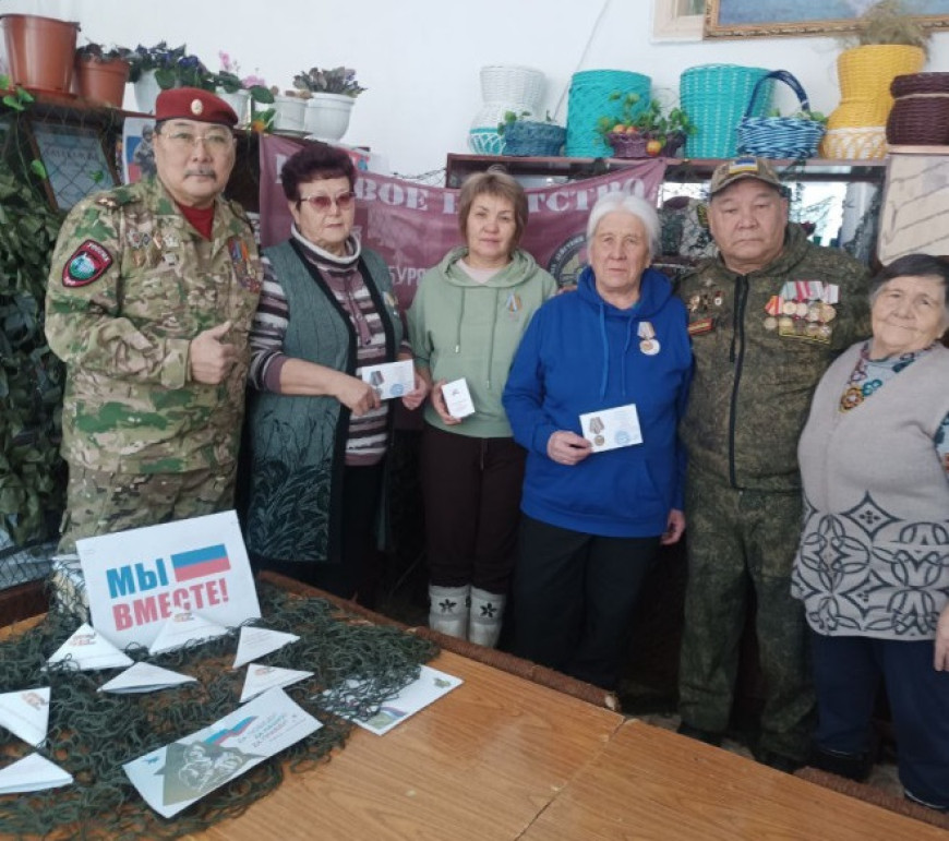 Медали «За помощь фронту» и «За помощь участникам СВО» вручили им члены Иволгинского отделения «БОЕВОГО БРАТСТВА» Александр Хамутаев и Василий Буянтуев.