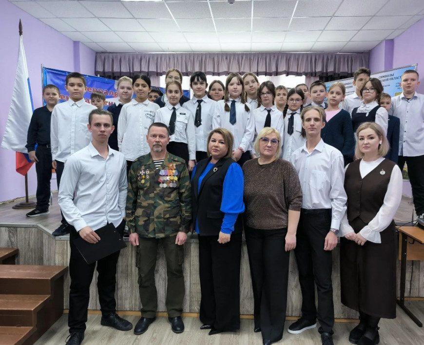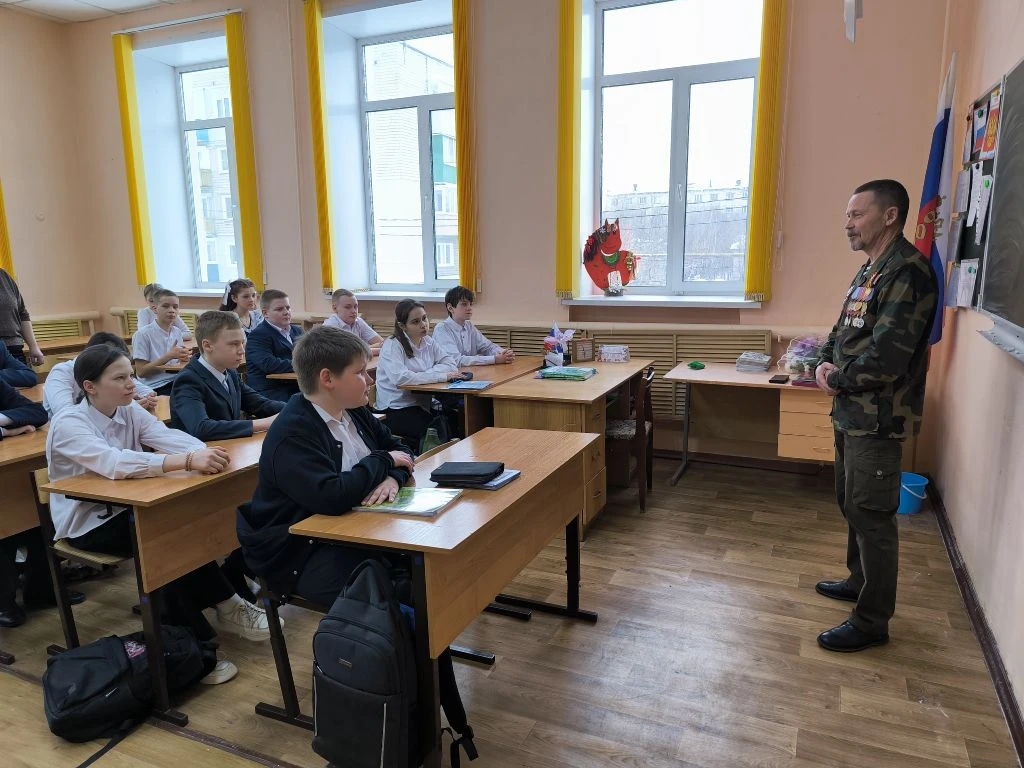 В классе он рассказал о себе, своей службе и боевых друзьях. Особо ветеран остановился на теме воспитания настоящего человека и патриота своей Отчизны, отметив, что для школьников их фронт в настоящее время — за партой. И тот фундамент, который они заложат сейчас за школьной скамьёй, и будет той основой по жизни, тем материалом, который сделает из нынешних подростков настоящих граждан и патриотов своей страны. Настоящих защитников, вне зависимости от выбранной профессии в будущем.