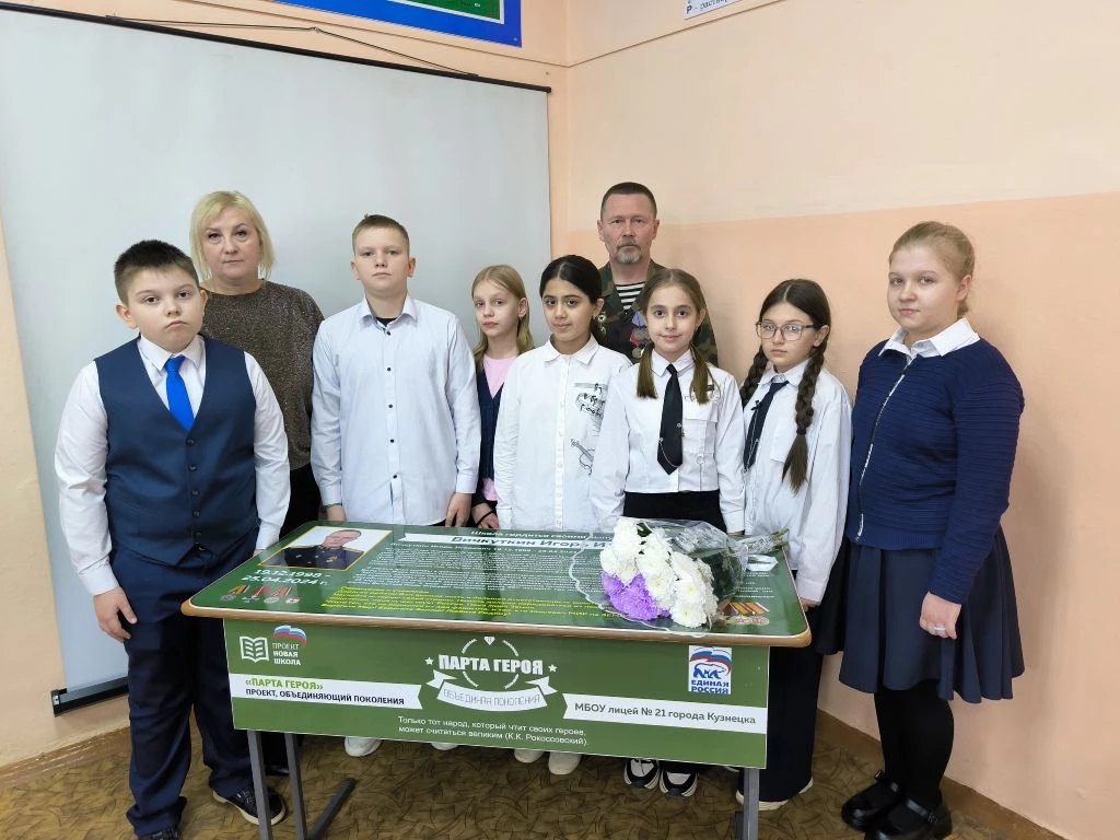 Затем Вадим Барышников вместе с лицеистами и педагогами возложили цветы к «Парте героя», посвящённой выпускнику школы, офицеру Игорю Вичкуткину, погибшему при исполнении воинского долга в ходе Специальной военной операции.