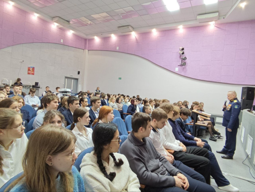 Владимир Харьков рассказал о принятом ещё в детстве решении быть военным, об учебе в Вольском военном училище, службе и участии в боевых действиях, о решении участвовать в СВО. Ветеран рассказал о жизни и боевых действиях участников СВО, показал фотографии и несколько трофеев с передовой. Он ответил на вопросы ребят.