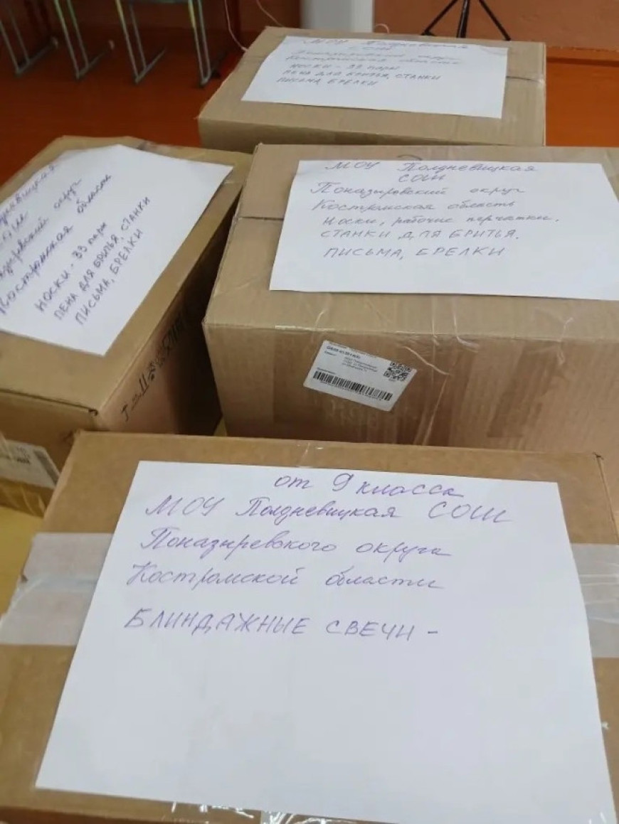 В ближайшее время волонтёры «БОЕВОГО БРАТСТВА» Шарьи отправят в зону СВО коробки с блиндажными свечами, вязаными носками, станками и пеной для бритья, талисманами и письмами от школьников.