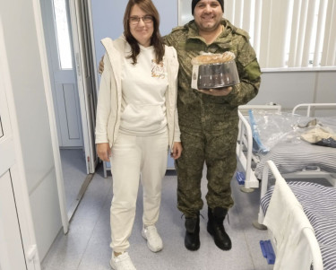 Полина Клинова из «БОЕВОГО БРАТСТВА» передала раненому бойцу торт и военную форму