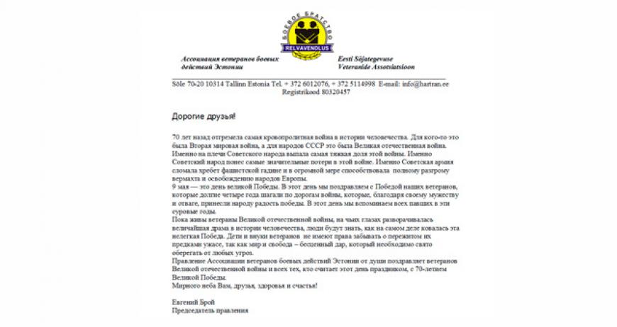 Правление Ассоциации ветеранов боевых действий Эстонии от души поздравляет ветеранов Великой отечественной войны и всех тех, кто считает этот день праздником, с 70-летием Великой Победы.