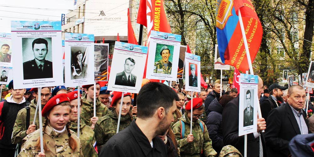 Многие несли штендеры с фотографиями своих отцов, дедов и прадедов-участников Великой Отечественной войны. Впервые в таком торжественном мероприятии рядом с фотографиями ветеранов Великой Отечественной, как бы продолжая связь времен и поколений, были фотографиикалужан, погибших в локальных войнах и военных конфликтах.Штендеры с их фотографиями были в руках кадетов и юнармейцев.