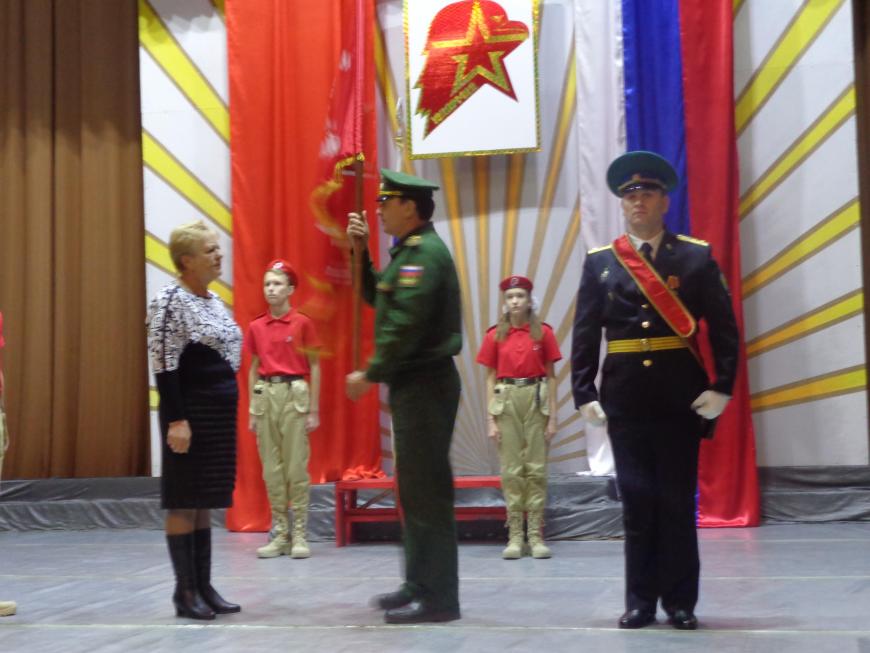 Член Забайкальского отделения Всероссийской общественной организации ветеранов, военный комиссар района вручил юнармейцам флаг.