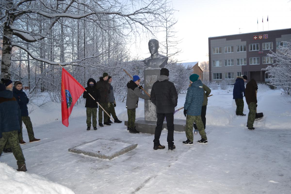 В городе Емве республики Коми 9 декабря прошло мероприятие по благоустройству территории у бюста Героя Советского Союза Гущина Н.Ф. Уборку снега возле памятника павшему во время Великой Отечественной войны бойцу организовали члены Княжпогостского отделения Всероссийской организации «БОЕВОЕ БРАТСТВО».