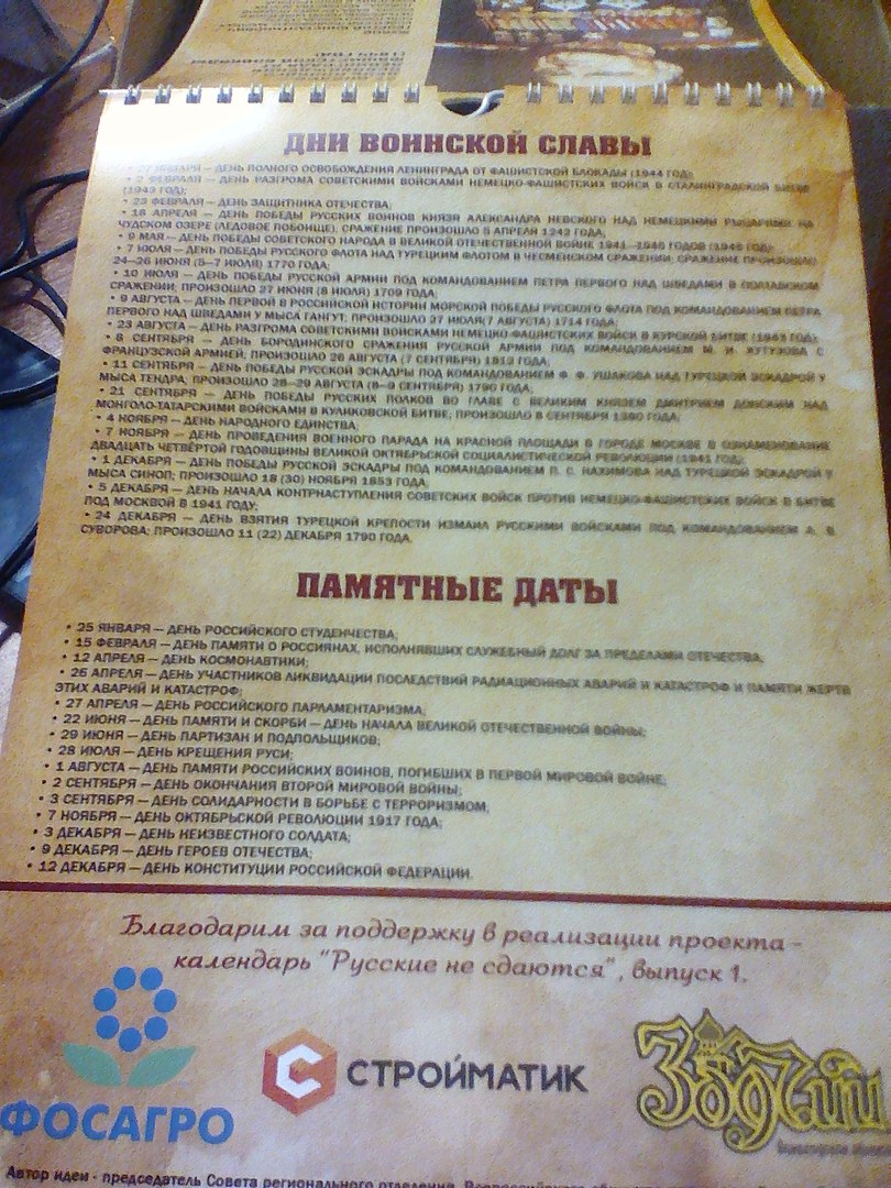 Череповецкое городское отделение «БОЕВОГО БРАТСТВА» в честь 20-летия организации выпустило квартальный календарь с памятными датами и днями воинской славы России — «Русские не сдаются».