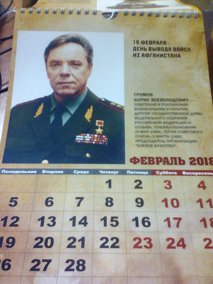 На страницах календаря размещены портреты воинов — от былинных богатырей до современных героев СССР и России, таких как Борис Громов и Юрий Воробьев.