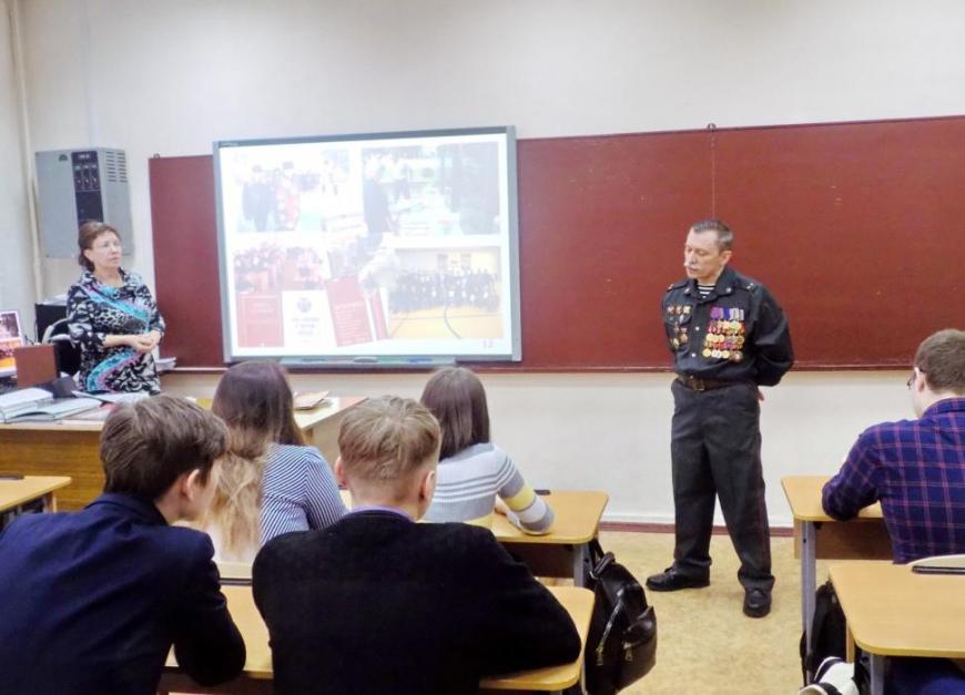 16 февраля в школе №8 г. Кулебаки председатель Кулебакского районного отделения Всероссийской общественной организации ветеранов «БОЕВОЕ БРАТСТВО» Алексей Викторович Буйняков встретился с учащимися 11 класса в преддверии праздника День защитника Отечества и провел урок мужества.