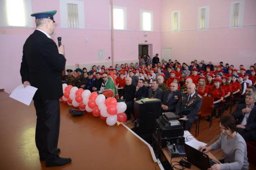В актовом зале героев встречали 300 учащихся, большая часть из них представляла «Юнармию».