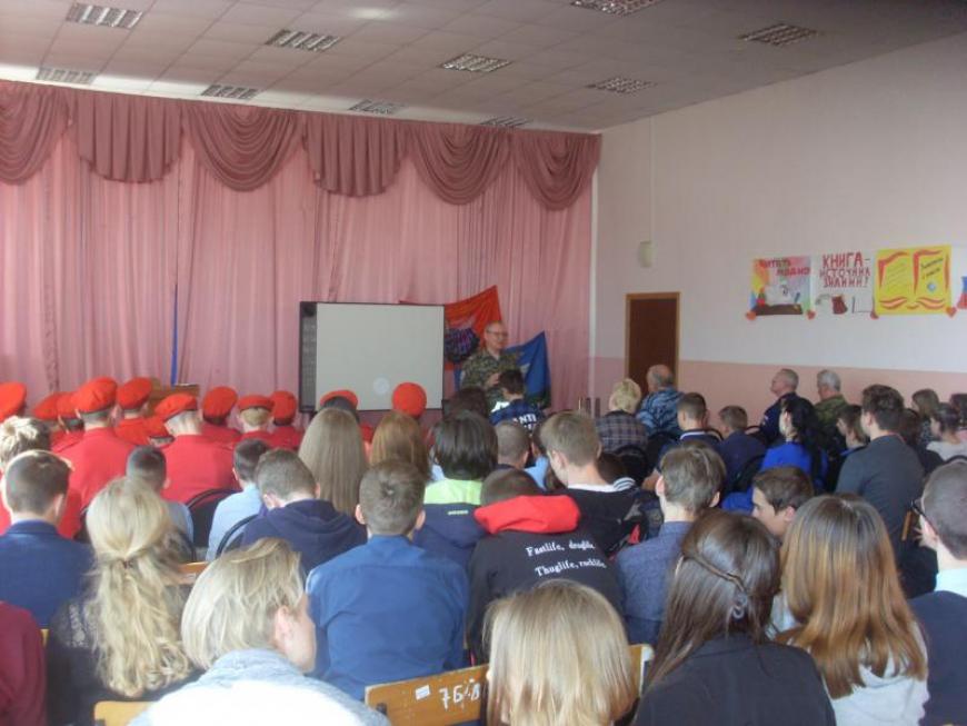 Поездка в район стала первой. Ветераны-десантники посетили Кривецкую среднюю образовательную школу Сеймского поселка, где учится более 200 детей. В актовом зале школы члены Курского отделения Союза десантников, а также руководитель Тимского отделения «БОЕВОГО БРАТСТВА», ветеран Афганистана Вячеслав Логачев и участник контртеррористической операции на Северном Кавказе Евгений Белых провели акцию «Георгиевская ленточка» и раздали юнармейцам символы Дня Победы.