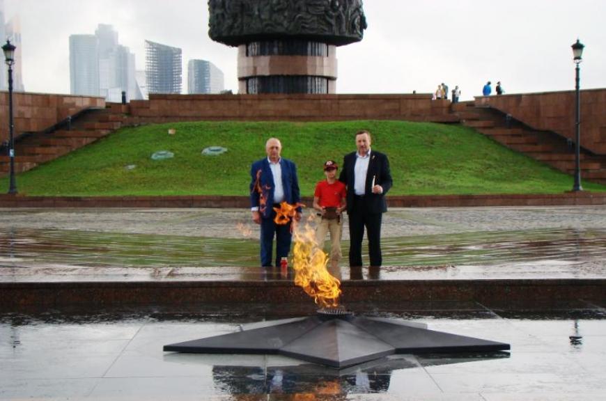Участники акции почтили память героев у Вечного огня на мемориальном комплексе на Поклонной горе, зажгли свечу памяти и возложили цветы.