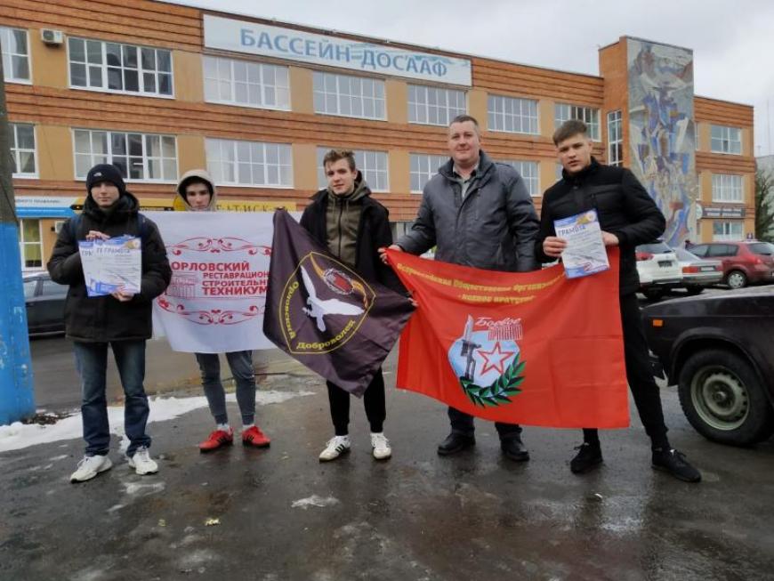 Орловское областное отделение «БОЕВОГО БРАТСТВА» совместно с региональным отделением Орловской области «ДОСААФ России» и МСВПЦ «Десантник» 13 февраля организовало поездку на открытие XVII Открытой Спартакиады среди допризывной молодежи — курсантов образовательных учреждений ДОСААФ СНГ, посвященной 75-й годовщине Победы в Великой Отечественной войне и Дню защитника Отечества в Брянске.