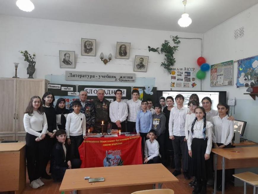 В этот день к старшеклассникам в гости пришли «афганцы» — члены Дагестанского республиканского отделения «БОЕВОГО БРАТСТВА» Магомед Гацайниев и Султан Даитбеков. Вместе с классным руководителем Мирой Щихалиевой ребята из 10А вместе с ветеранами посмотрели фильм, посвященный блокаде Ленинграда. После него состоялось обсуждение увиденного.
