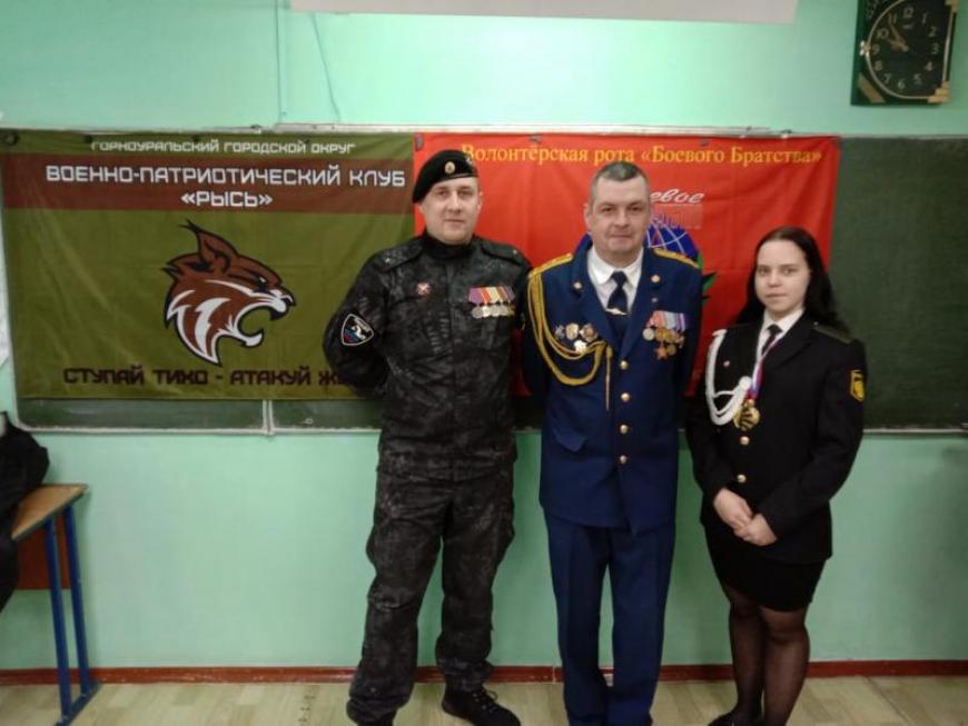 Перед учащимися выступил подполковник запаса ВВ МВД РФ, ветеран боевых действий, 15-кратный чемпион мира по гиревому спорту Сергей Бестужев и боец «Волонтерской роты „БОЕВОГО БРАТСТВА“», чемпион Уральского федерального округа по армрестлингу Юлия Мальгина.