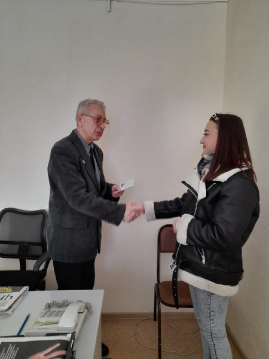 Удостоверение Анастасии вручил ветеран боевых действий на Северном Кавказе и в Приднестровье Анатолий Полежаев.