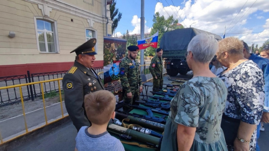 Члены Омского «БОЕВОГО БРАТСТВА» и активисты Омской «Волонтерской роты» организовали на территории рядом с Успенским собором выставку советского и современного оружия.