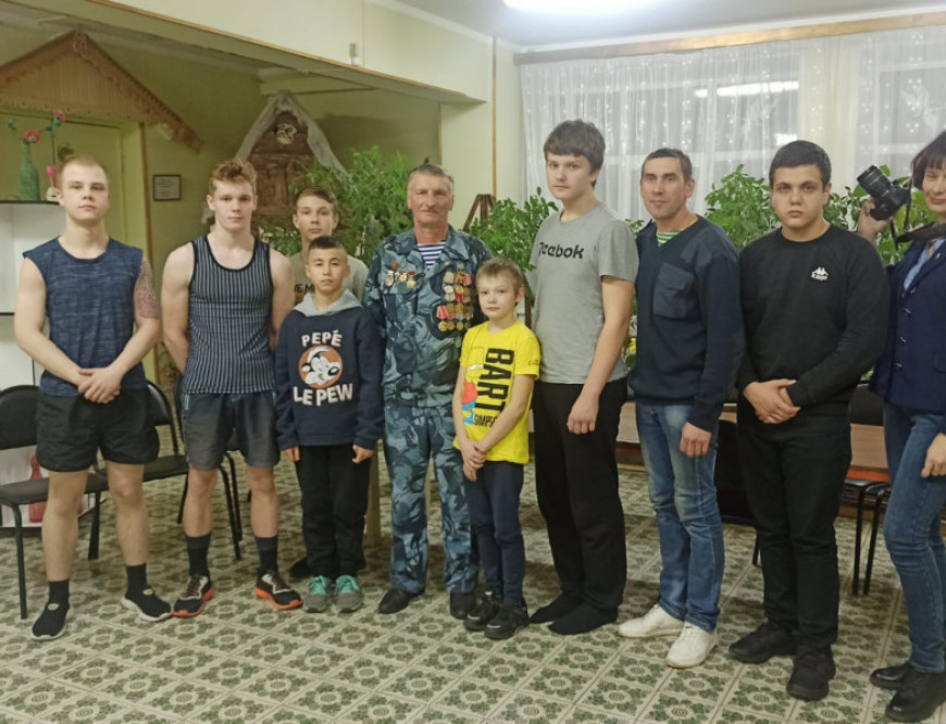 Перед ребятами, посещающими кружки и секции клуба, выступили ветераны боевых действий Анатолий Радеев и Андрей Аросланов. Анатолий Радеев рассказал о жаркой и далёкой стране Афганистан, о своём боевом прошлом, исполнил под гитару песню «Память». Андрей Аросланов поведал о своей службе, которая проходила в Чеченской Республике. Татьяна Павлова напомнила о том, что в Угличе жил Андрей Харламов — морпех, выполнивший свой воинский долг до конца, участвуя в Чеченской войне.