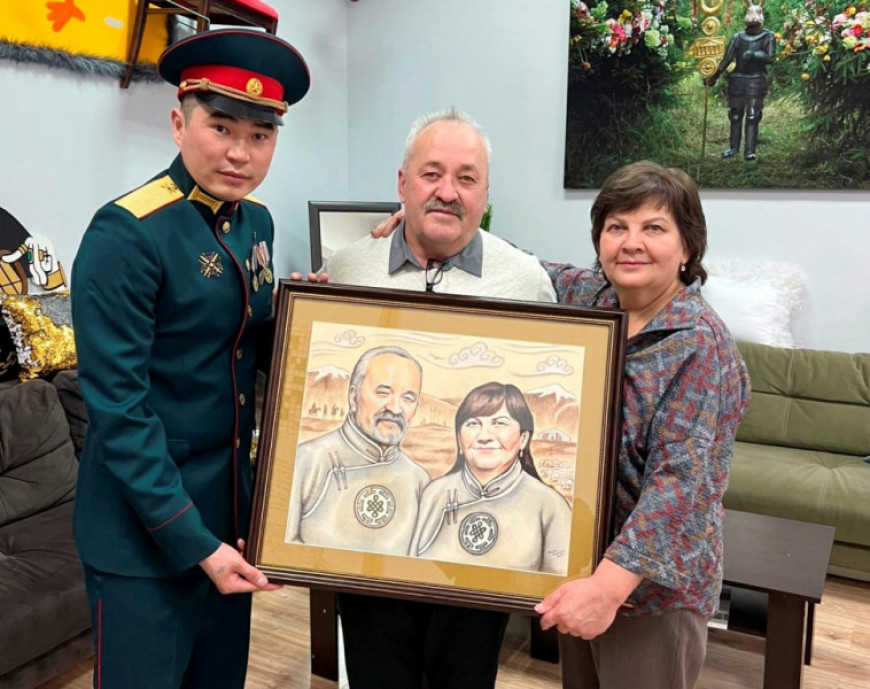 Член Тувинского регионального отделения «БОЕВОГО БРАТСТВА», участник СВО Ачыты Нурзат в знак благодарности 7 марта вручил Обрезановым семейный художественный портрет, написанный другим членом региональной организации Радмиром Балганом.
