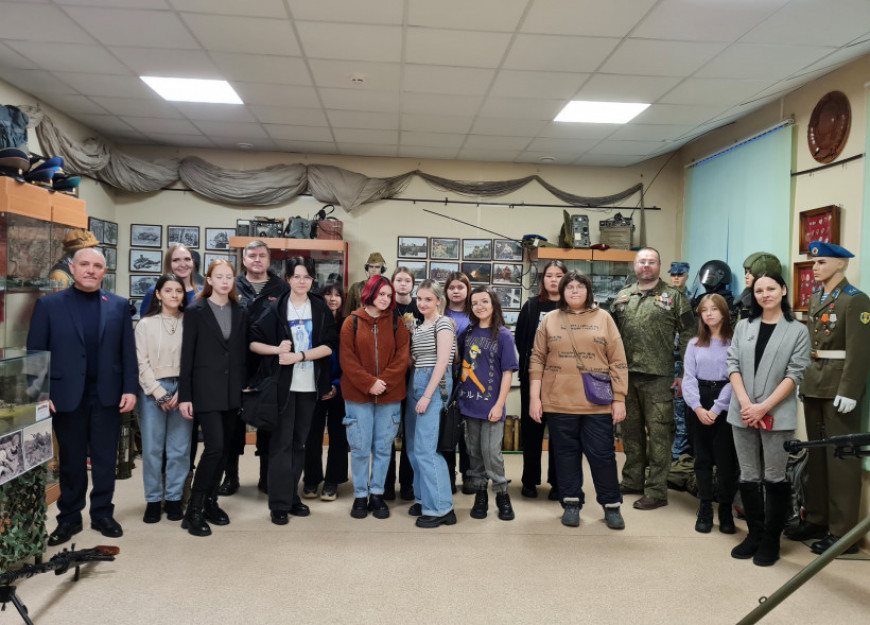 Часовую экскурсию по музею провели члены отделения, ветераны боевых действий Олег Шалдаев и Андрей Мусатов. Студентов ознакомили с экспозициями и экспонатами времён Великой Отечественной войны, событий в Афганистане, первой и второй военных кампаний в Чеченской Республике, а также Специальной военной операции. Студенты могли примерить военную форму разных времён, подержать в руках макеты оружия, задать вопросы ветеранам.