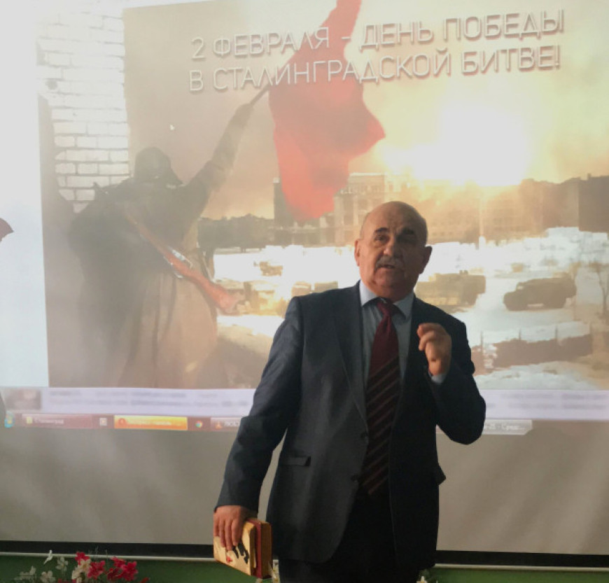 Заместитель председателя Совета ветеранов Моздокского района, председатель местного отделения «БОЕВОГО БРАТСТВА» Владимир Гречаный рассказал 102 студентам второго и третьего курсов о значении Сталинградской битвы, силах сторон, участвовавших в сражении, подвигах защитников Сталинграда, сути, значении и цене лозунга его защитников «За Волгой для нас земли нет!».