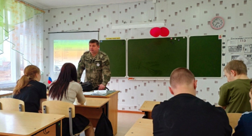 Занятие провели руководитель Гайнского «БОЕВОГО БРАТСТВА», ветеран боевых действий в Чечне Евгений Жижилев и член ветеранской организации Тимофей Мельчаков. Тема урока была посвящена бойцам СВО. Говорили о помощи землякам: о сборе гуманитарной помощи, изготовлении маскировочных сетей, блиндажных свечей.