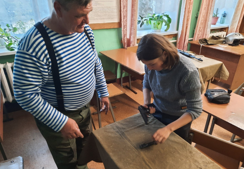 Под руководством ветерана ребята вспомнили навыки разборки-сборки автомата Калашникова и пистолета Макарова.