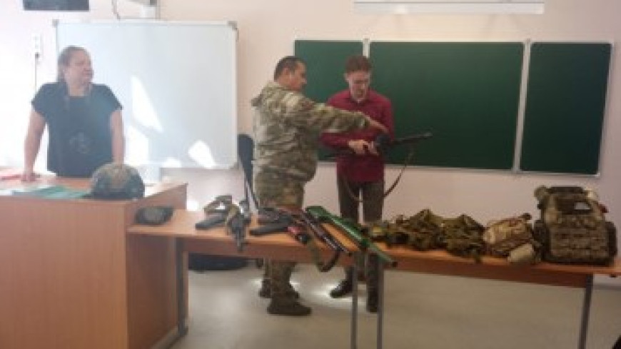Урок мужества провели активисты Александр Ким, Юлия Рзянина и Валентина Шляпникова. На уроке было предоставлено оружие, которое использовалось в зоне СВО, защитные средства, бронежилеты.