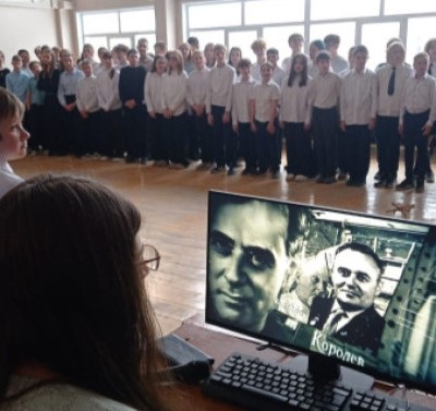 Затем Андрей Моисеев рассказал школьникам о Сергее Королеве, который способствовал развитию космонавтики и созданию ракетно-ядерного щита страны. Под его руководством были разработаны и сданы на вооружение первые отечественные ракеты дальнего действия на высококипящих, низкокипящих и твердотопливных компонентах топлива. Лекции сопровождались показом видео-фильмами, ученики слушали с большим интересом, задавали вопросы.
