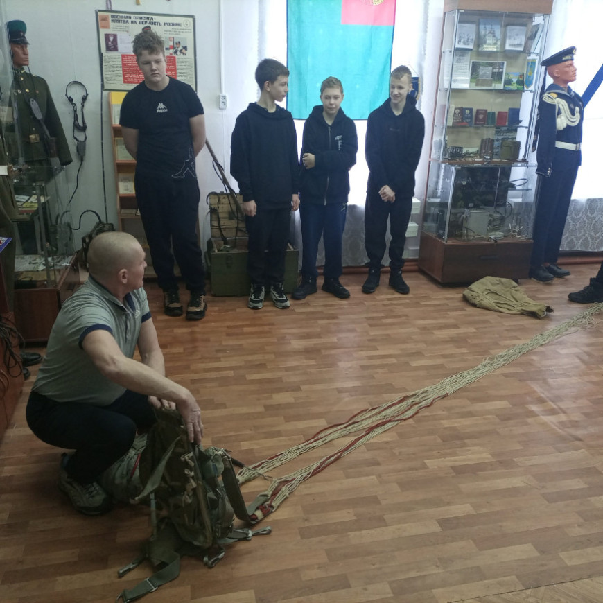 Занятие по парашютной подготовке провел член районного отделения «БОЕВОГО БРАТСТВА», ветеран боевых действий в Республике Афганистан Александр Абанин. Рассматривались конструкция и сборка парашюта, дети учились правильно сгруппироваться перед прыжком.