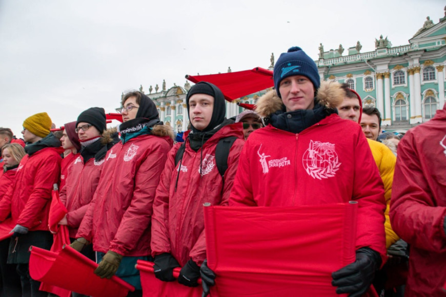 На Дворцовой площади Санкт-Петербурга более 3,5 тысячи волонтёров выстроились в российский флаг и слово «Защитники». Таким образом они поздравили с 23 февраля ветеранов, участников Специальной военной операции и всех, кто защищал и защищает границы нашей Родины.
