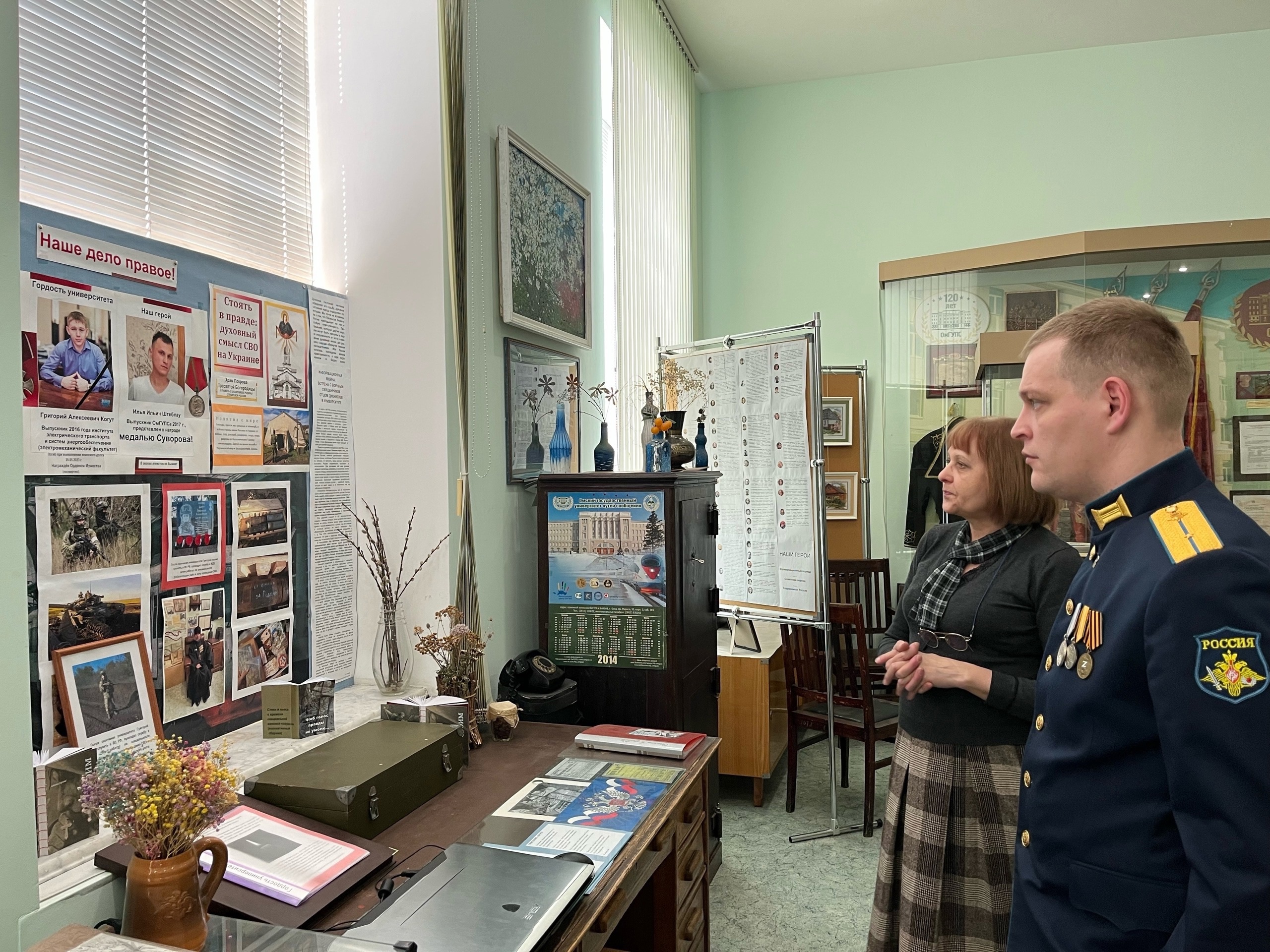 После урока мужества ветеран посетил музейную позицию университета, ознакомился с историей выпускников вуза — участников СВО.