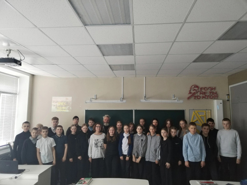 Руководитель Сокольского отделения «БОЕВОГО БРАТСТВА» Виктор Чебыкин рассказал ребятам о геополитической ситуации, сложившейся на Руси к сороковым годам ХIII века, ходе битвы, участниках сражения, климатических условиях того времени, тактических решениях Александра Невского и значении победы русских воинов в битве на Чудском озере. Слова Александра Невского «Нас немного, а враг силен, но Бог не в силе, а в правде!» на века стали девизом русского народа.