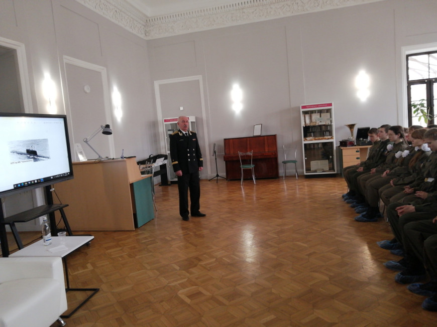 Старшеклассники встретились с ветераном-подводником, служившим командиром  подводной лодки, капитаном I ранга Игорем Кузиным. Он рассказал старшеклассником о зарождении подводного флота в России, о первых дизельных и атомных лодках, о самой большой подводной лодке – тяжелом ракетном подводном крейсере стратегического назначения проекта 941 «Акула».