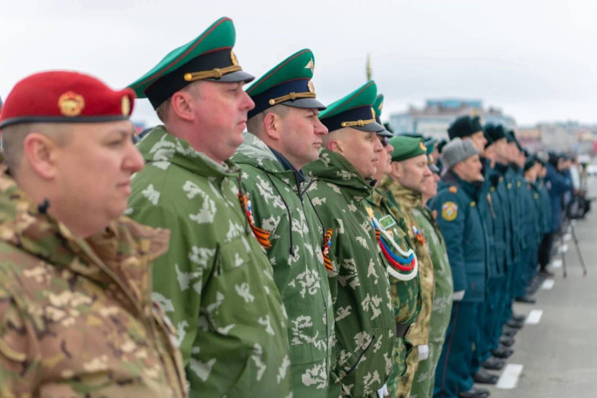 Командующий парадом — военный комиссар ЯНАО полковник Михаил Торовин. За знаменной группой первой колонной проследовали ветераны боевых действий. Это члены «БОЕВОГО БРАТСТВА», участники военных конфликтов и Специальной военной операции, ямальцы, награждённые государственными боевыми наградами. Возглавил их парадную коробку кавалер ордена Мужества Кирилл Дзитоев.