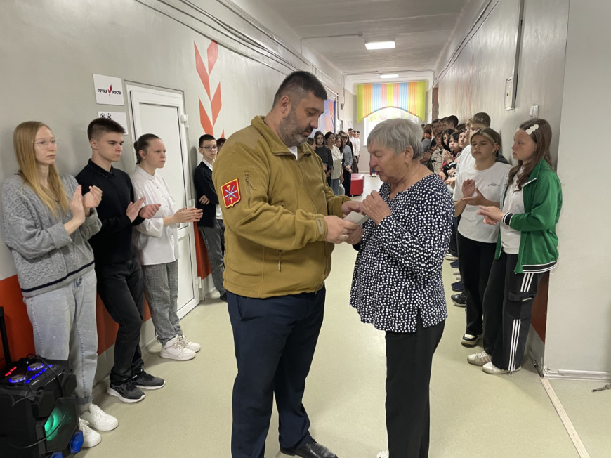 На общешкольной линейке Константин Ферапонтов передал Анне Лепиховой награду — медаль «30 лет Чеченской кампании», выразил слова благодарности.