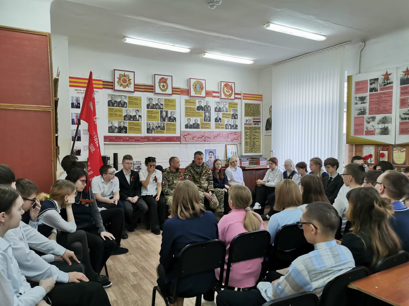Ветераны СВО Юрий Хоменко и Юрий Лебедев рассказали школьникам о боевых буднях бойцов, о фронтовом братстве, о быте в зоне боевых действий, о тяжёлой работе и курьёзных случаях, произошедших на передовой, о том, что «на войне как на войне».