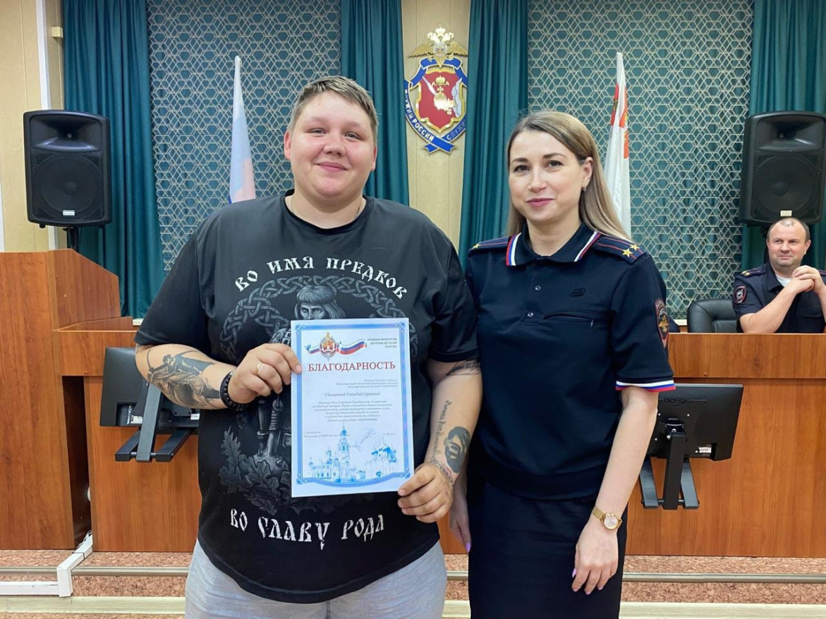 Заместитель начальника участковых уполномоченных полиции и подразделений по делам несовершеннолетних «Вологда» Валентина Ромина поблагодарила за активную гражданскую позицию и оказание помощи правоохранительным органам в различных сферах деятельности штаб «Волонтерской роты «БОЕВОГО БРАТСТВА» Вологодской области.