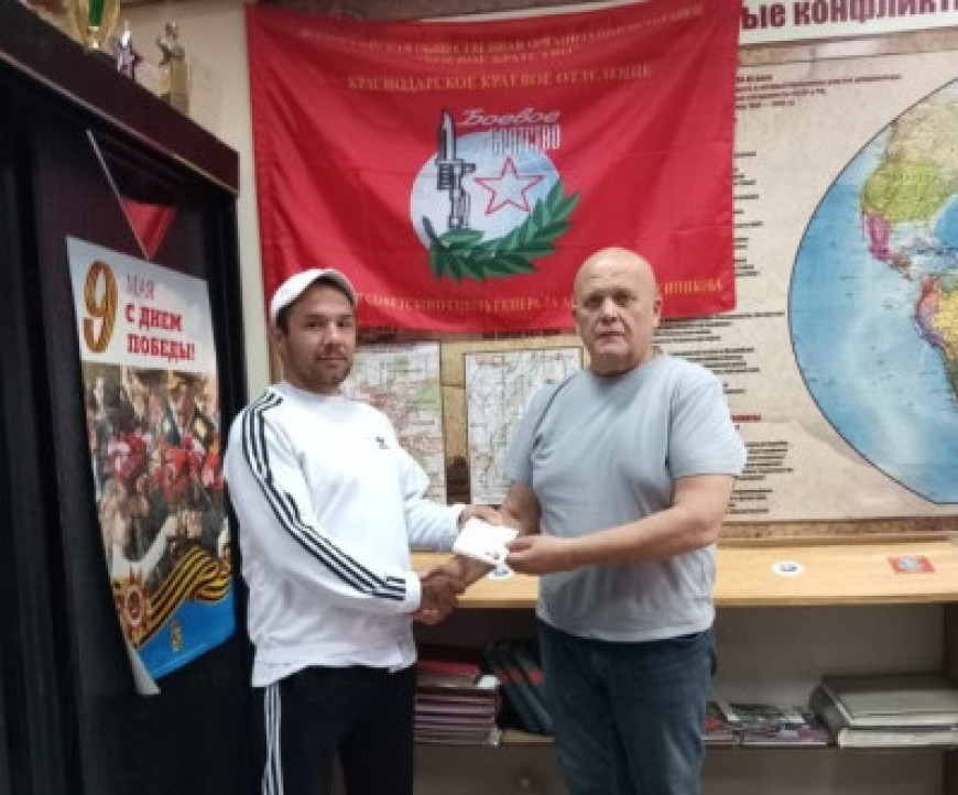 18 июня председатель правления Краснодарского городского отделения «БОЕВОГО БРАТСТВА» Михаил Кондратьев вручил членский билет организации участнику Специальной военной операции Сергею Шевчуку.