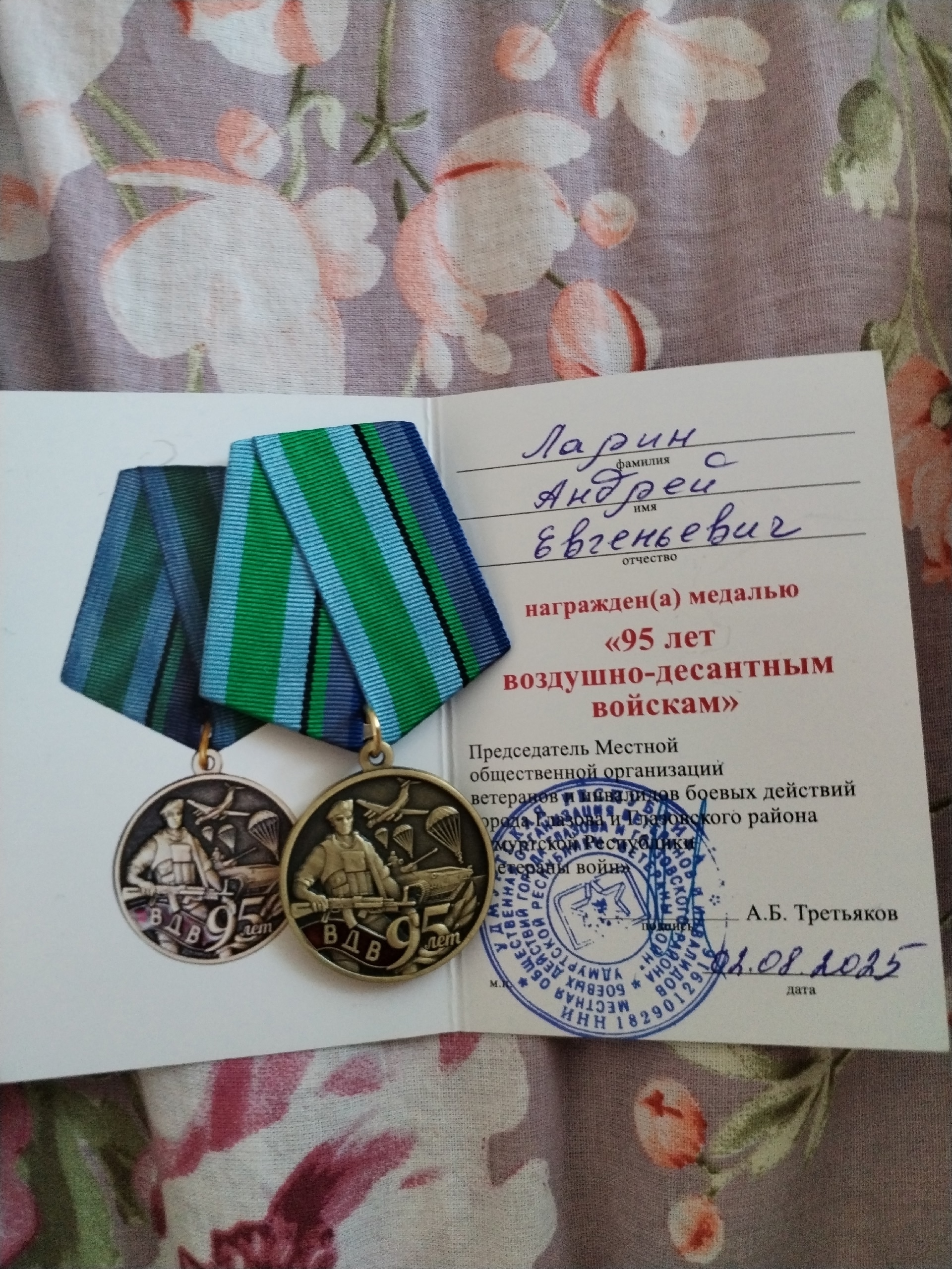 Заместитель руководителя Глазовского отделения «БОЕВОГО БРАТСТВА», ветеран ВДВ Андрей Ларин за заслуги перед Воздушно-десантными войсками и в связи с юбилейной датой был награждён медалью «95 лет ВДВ».