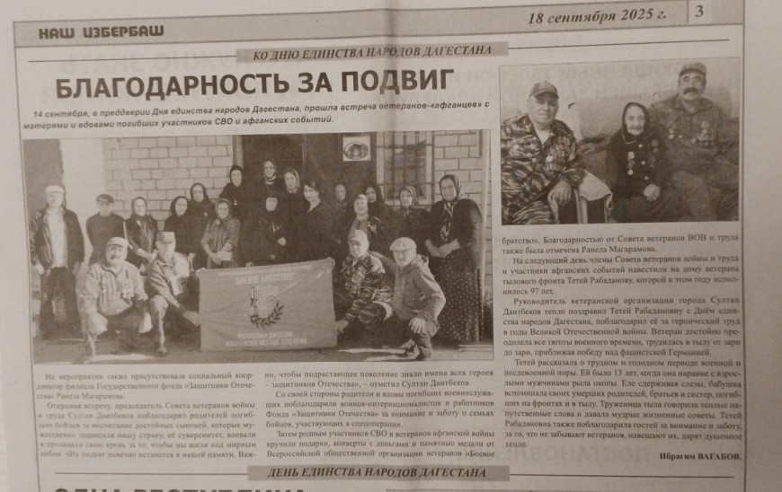 О работе местного отделения «БОЕВОГО БРАТСТВА», в том числе и о встрече с Тетей Рабадановой, опубликовала материал местная газета.