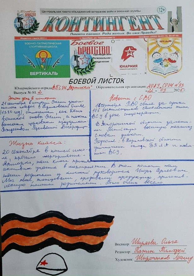 “Редакторы подготовили и выпустили “Боевые листки” № 81.1 и 81.2. Темами выпусков стали Куликовская битва, героические действия защитников Отечества в ходе СВО на Запорожском направлении, прошедшая в школе весенняя ярмарка, спортивный фестиваль туризма “Оренфэст», в котором юнармейцы активно участвовали», - рассказал руководитель школы “Вертикаль” Леонид Колчинский.