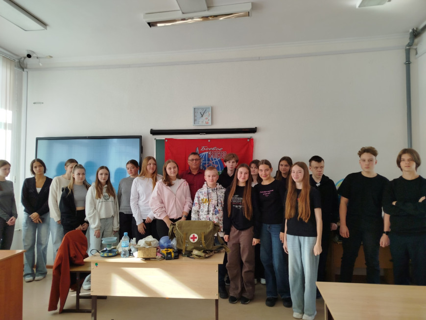 Вячеслав Гурьянов провёл мастер-класс по оказанию первой доврачебной помощи, отработал с учениками алгоритм действия повязок, жгута при разных видах кровотечения, показал различные виды медицинского оборудования для спасения пострадавших. Школьники познакомились с индивидуальной аптечкой бойца, турникетами и кровоостанавливающими средствами.
